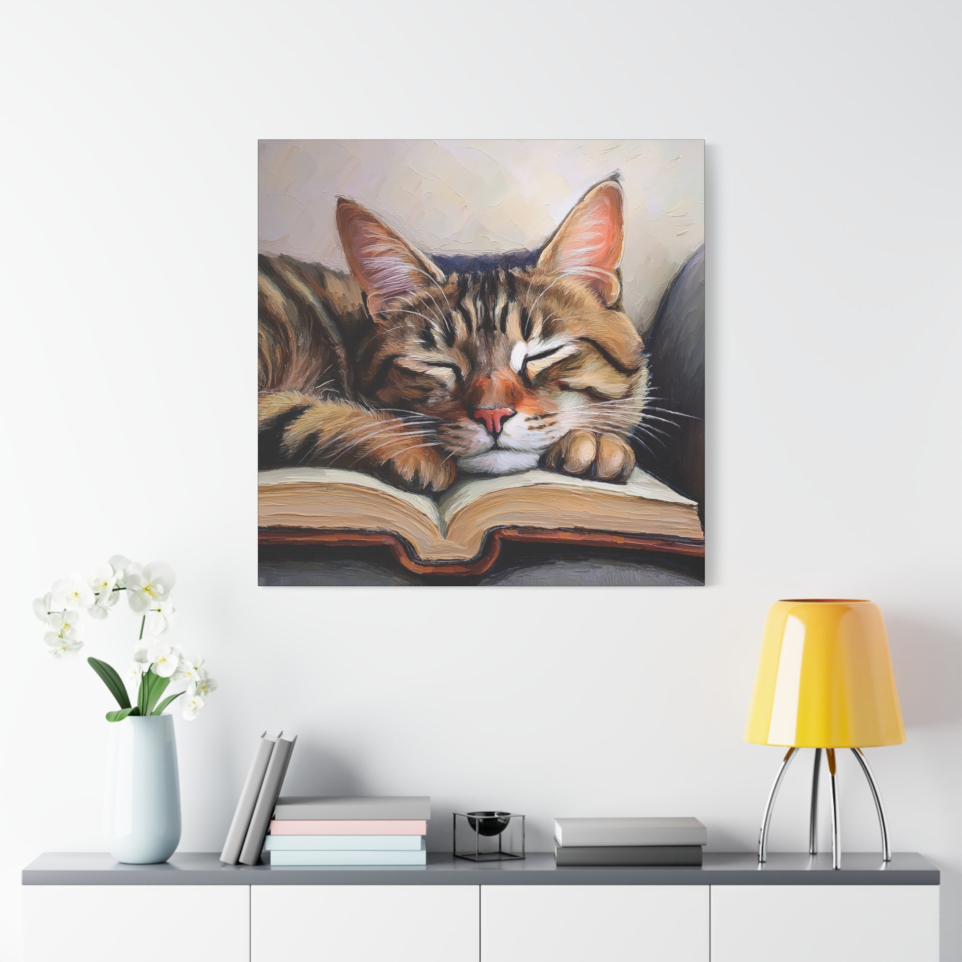 Premium canvas paint style print of a tabby cat sleeping on book.